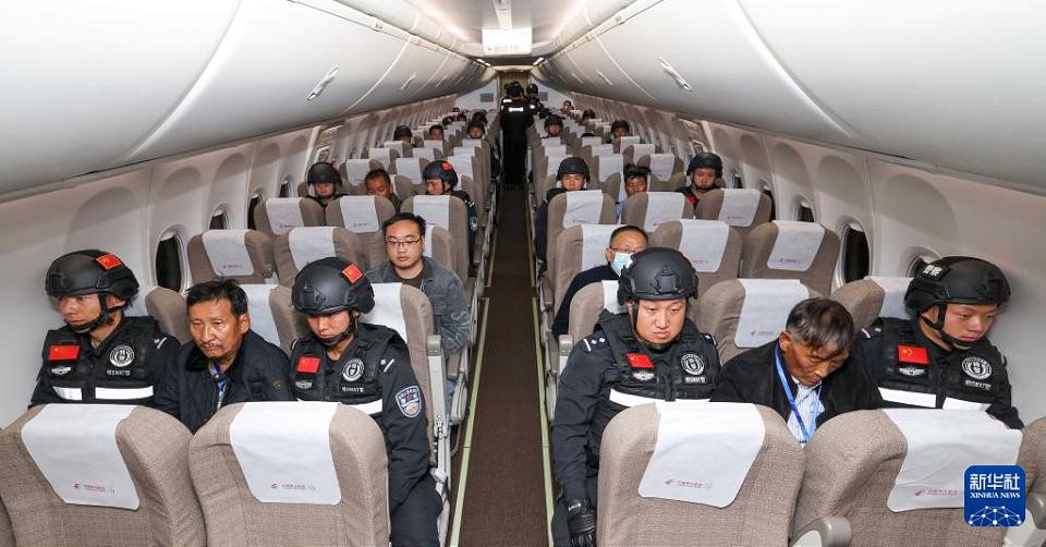 1月30日,白所成、白應蒼、魏懷仁、劉正祥、劉正茂、徐老發等10名緬北重大犯罪嫌疑人在被押解回中國的飛機上。 新華社記者 殷剛 攝