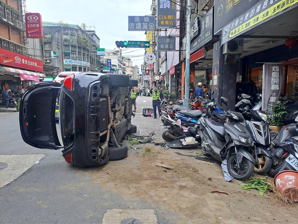 車禍現場一片狼藉,肇事賓士車輛側躺在路中,停放一旁機車被撞的東倒西歪,還有盆栽肘整個支離破碎,而事發時1名70歲老婦被撞後壓在車下,許多路人見狀幫忙推翻車輛,警消抵達時,發現老婦左額15cm撕裂傷,左小腿變形,當場沒了呼吸心跳,被緊急送往醫院救治,最後仍回天乏術。