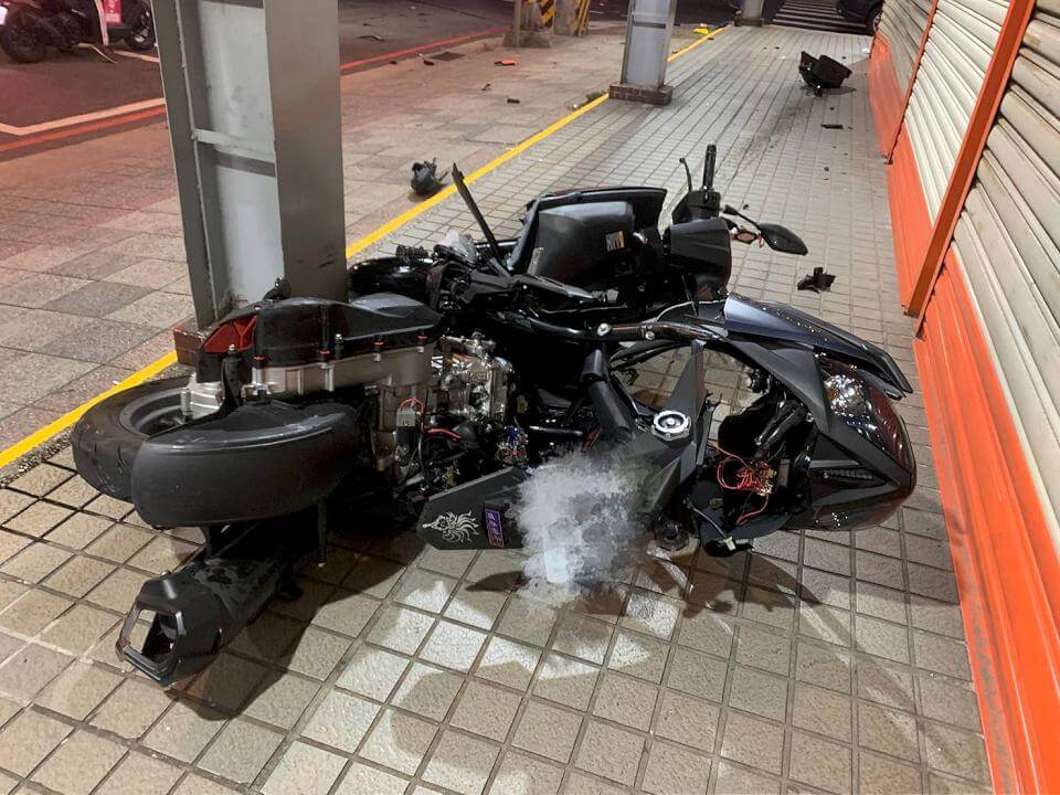 由於撞擊力道不小,機車幾乎解體。畫面讀者提供