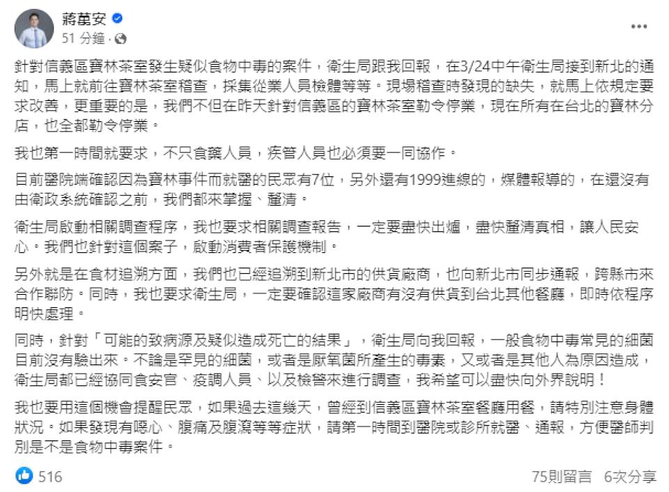 台北市長蔣萬安在臉書貼文表示,目前根據醫院確認因為寶林事件而就醫的民眾有7位,3月26日陸續接獲台北醫學大學附設醫院、新光醫院及三軍總醫院通報民眾3人,都發生噁心、嘔吐及腹瀉等症狀,衛生局啟動相關調查程序,我也要求相關調查報告,一定要盡快出爐,盡快釐清真相。