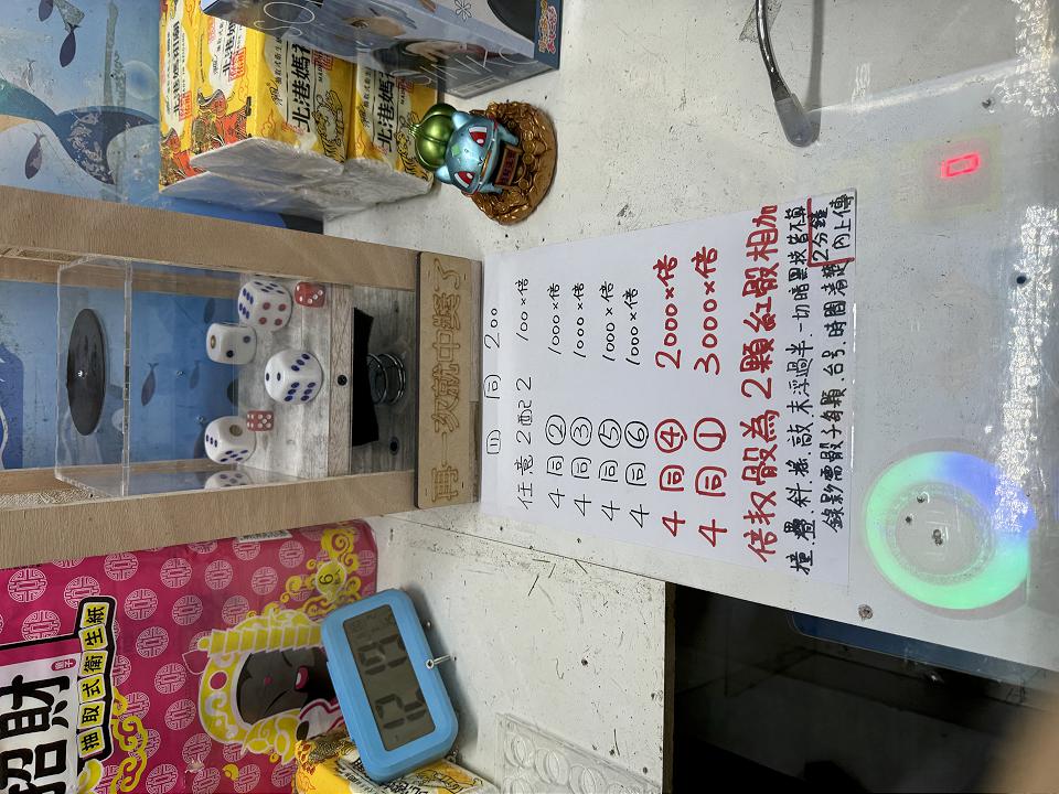 警方調查,娃娃機店游姓主嫌將選物販賣機台改裝為擲骰子換獎金,將夾物改為放入骰子的壓克力方框,每玩一次投幣100元到200元不等,業者在機台貼出擲骰換獎金的玩法,以最多的9骰機台為例,依骰子同色或同數的多寡,可換取9000至最高30萬元獎金,因此吸引不少賭客上門。