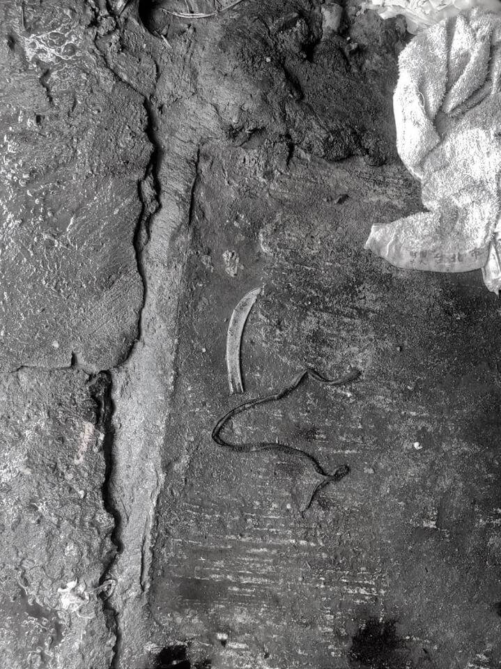 警方在現場發現砍斷的鐮刀。畫面讀者提供