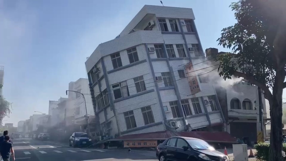 這起強震在花蓮地去造成強大破壞,軒轅路上的「天王星大樓」嚴重傾斜約45度,1棟房屋整個1樓早餐店消失,蘇花公路更是多處嚴重坍方,大清水隧道前道路消失,有多部車輛急數十人員受困,有1名貨車駕駛遭落石擊中,已由救難人員徒步運送出災區,送往醫院急救中。(記者雷軒/花蓮報導)