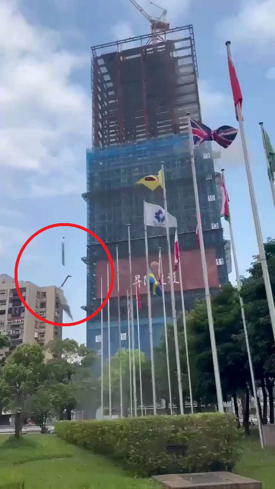 台北市基隆路上的新建工地吊臂掉落。翻攝社會事新聞影音