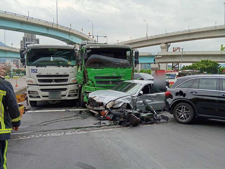 新北市台64線台北港匝道口,6日10時許發生嚴重車禍,1輛砂石車疑似煞車失靈,直接衝撞前方7部大小車輛,其中1輛大型重機後座女乘客,受困車下已經失去生命跡象,警消將人救出後緊急送醫,由於車禍現場佔據匝道全線車道,警方封閉路段引導提前改道。