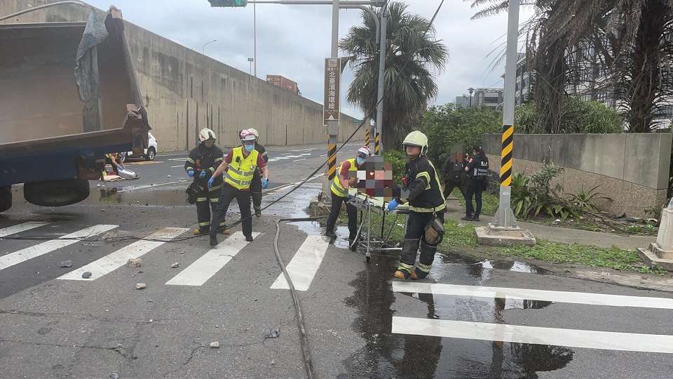 台61線桃科高架路段,6日10時許發生砂石車墜落意外,駕駛當場彈飛出車外,躺在車道上沒了呼吸心跳,而砂石車頭整個被壓扁成鐵餅,警消將人緊急送醫救治,但相關車禍發生原因,警方還要調查釐清。