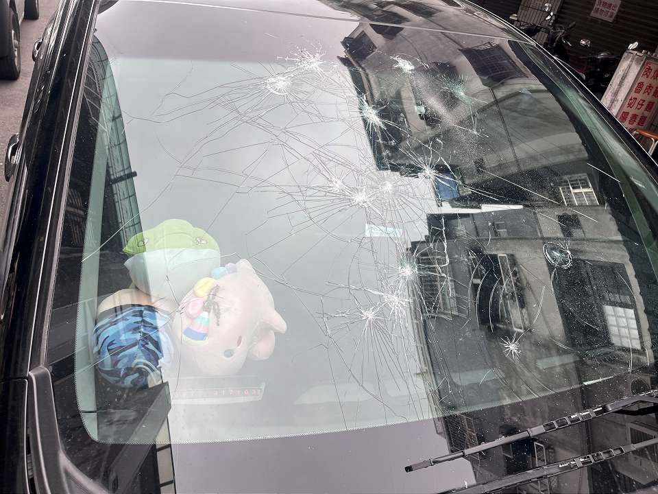 仲姓住戶用榔頭敲破擋住家門的車輛擋風玻璃。讀者提供