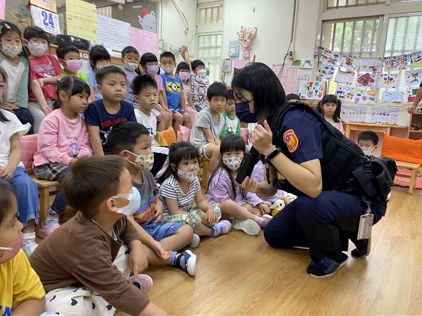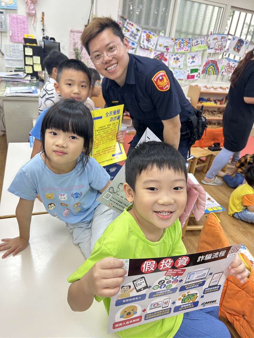 另因應詐騙猖獗,現場以生動活潑互動遊戲方式,讓小朋友認識相關詐騙手法及防範因應之道,將識詐觀念深植孩童心中,以提昇識詐、交通及婦幼安全意識及強化自我防衛能力,共同 打造一個安全就學環境。