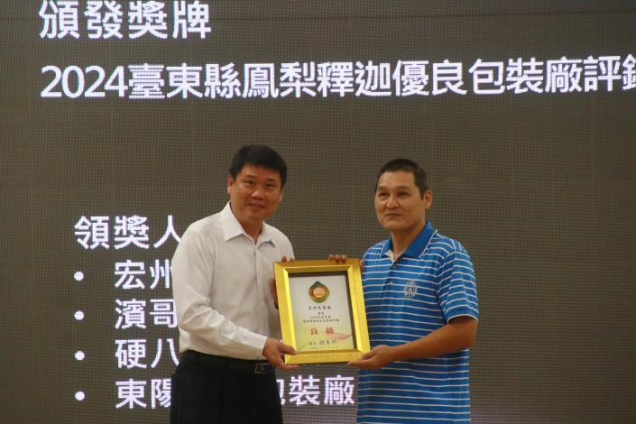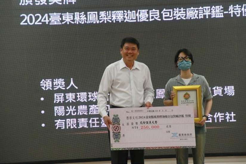 為期3個月、119次的包裝廠評鑑作業,臺東縣政府揭曉113年度「鳳梨釋迦優良包裝廠評鑑」得獎名單,並於2日縣務會議暨擴大主管會報頒獎表揚,臺東縣長饒慶鈴恭喜陽光農產包裝廠等10家業者脫穎而出,同時肯定獲獎包裝廠對品管的堅持,期盼成為臺東包裝廠的學習典範,共同維護高品質果品,永續產業發展。