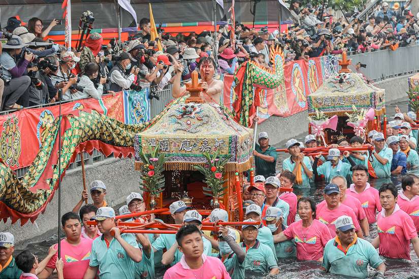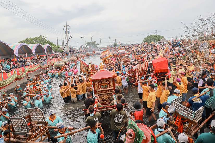 蔡易餘說,「衝水路、迎客王」是重要的民俗文化,傳說在農曆3月27日王爺生日這天,來自山海的20尊客王會抵達新塭王船碼頭,由在地的尹王爺和九龍三公親自下水迎接,現場氣氛非常熱鬧,場面無比盛大,尤其今天親自下水體驗衝水路時,水面幾乎淹到脖子,非常刺激、也很有意義。