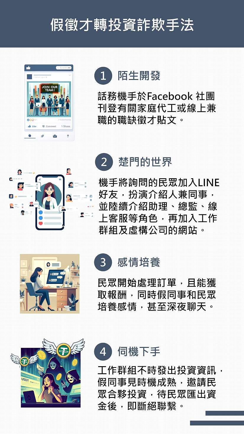 刑事局偵查第二大隊分析近期詐騙案件,發現有民眾於社群平台接觸家庭代工廣告,事後卻遭假投資詐騙,經深入追查,該集團於Facebook刊登徵才廣告,內容多為居家辦公、訂單處理之工作內容,再要求諮詢職缺之民眾加入LINE好友,等詐騙手法。