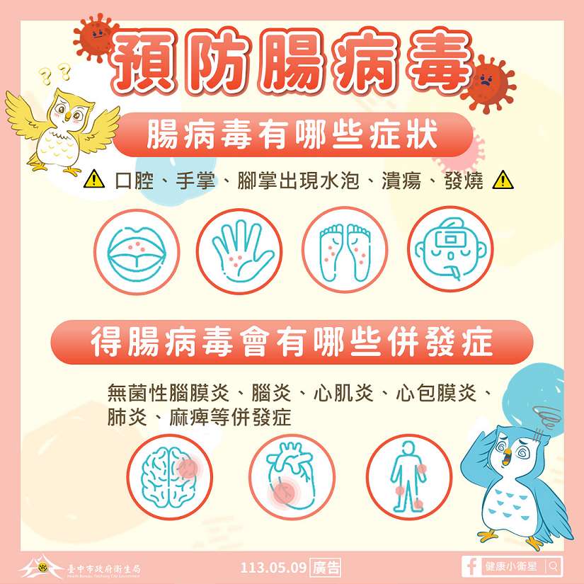 母親節將至,親子同樂機會增加,台中市政府衛生局表示,截至昨(9)日國內腸病毒感染併發重症病例累計1例,台中市迄今無重症確定病例,提醒家長及照顧者,參與各項活動及聚會時,務必正確洗手護健康,家中幼童如出現發燒、出疹等不適症狀,請儘速就醫,才能溫馨快樂過佳節。