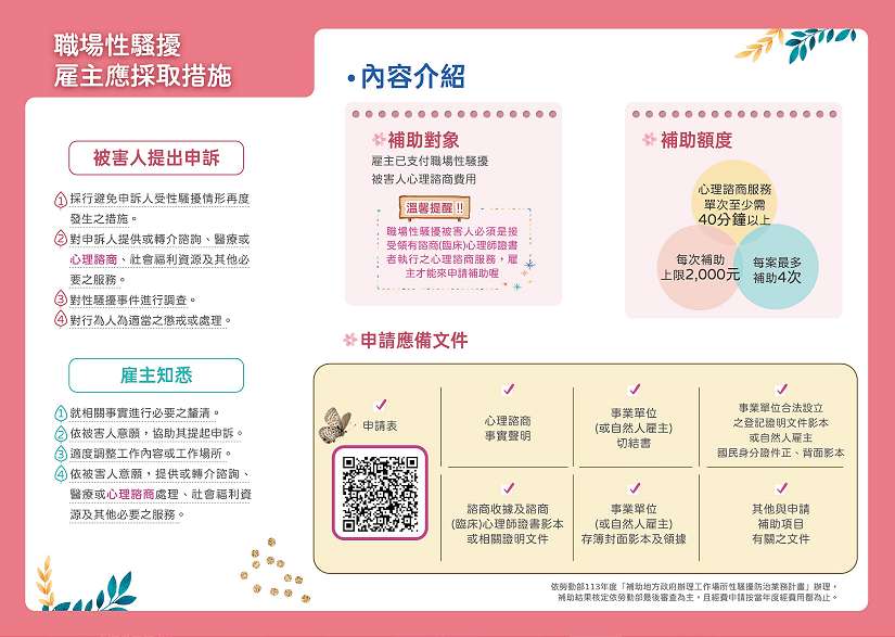 雇主接獲職場性騷擾,協助受職場性騷擾的申訴人尋求合法心理諮商服務,桃園市補助雇主職場性騷擾心理諮商費用,每次諮商時間達40分鐘以上,單次可補助新臺幣2,000元,最多補助4次,最高8,000元哦!
