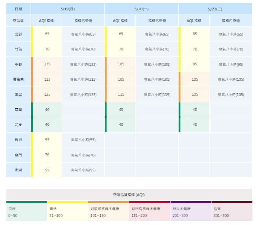 環保局指出,依預報資料顯示,昨(18)日環境風場為東北東風,台中市部分地區於午後因臭氧濃度偏高、空品達「橘色提醒」等級,今日環境風場為東北東風至偏東風,迎風面擴散條件普通,中南部位於下風處,污染物易累積,午後受光化作用影響,臭氧濃度易上升;20日鋒面接近,環境風場為偏東風至東南風,西半部擴散條件差,污染物稍易累積,午後受光化作用影響,臭氧濃度易上升。