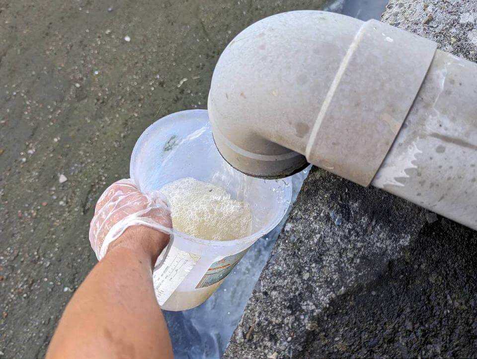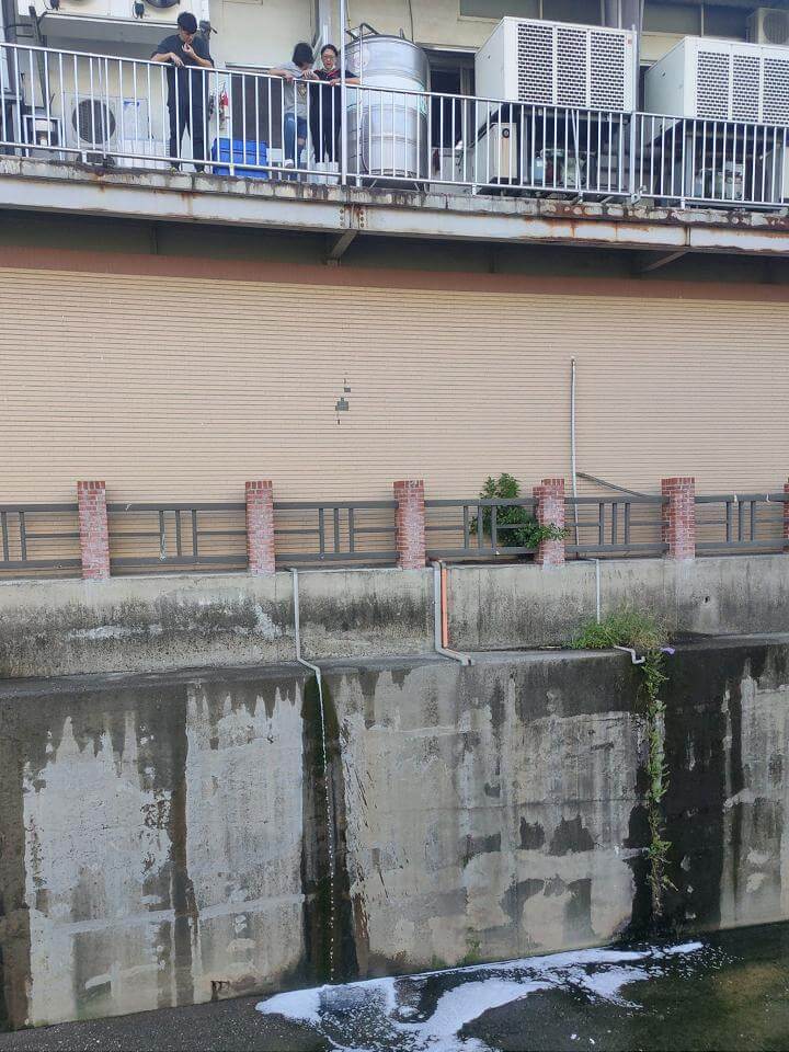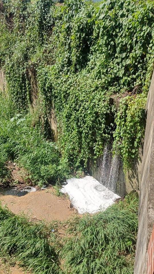 麵包工廠清洗地板廢水排放至鳳山圳產生大量白色泡沫。翻攝高雄市政府
