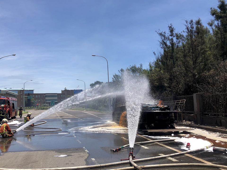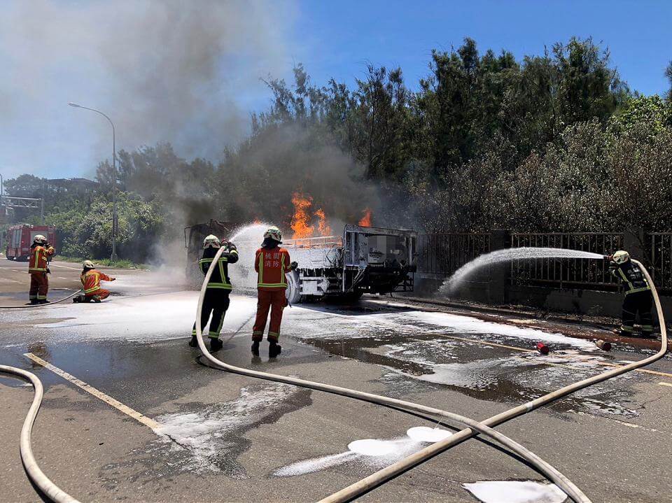 台61線桃園觀音段4日10時許,發生1輛載滿化學液態廢料貨車起火燃燒,由於當時車輛還行進間,駕駛與助手2人為了不讓災情擴大,還先將車輛停在路邊後,才趕緊跳車逃生,當警消抵達時,整台車已經陷入火海,所幸約1時就將火勢撲滅,起火原因還需要調查。