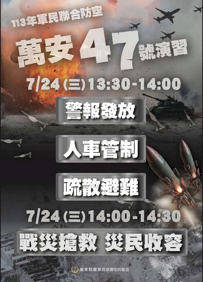 臺東地區113年軍民聯合防空(萬安47號)演習,將在本(7)月24日(星期三)下午13時30分至14時實施,演習警報發放後,人車請遵守軍、警及民防人員疏導或就地疏散避難,在室內者請關閉門窗、水電、瓦斯及熄滅燈火。演習期間將實施人車管制,請預先規劃提早出門,以免延誤行程,違反管制者,依民防法第25條規定處新臺幣3萬元以上15萬元以下罰鍰。