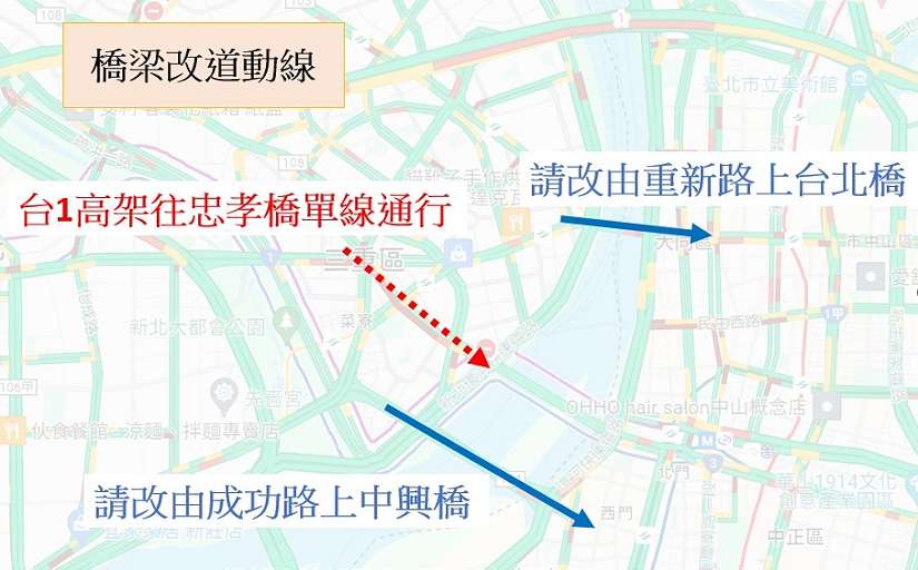 交通局並指出,台1高架事故路段下方的三重區重安街平面道路(集美街至中正南路),於搶修施工期間亦持續封閉,請欲往台北的用路人遵循現場員警疏導改道,改由集美街行經新興路,再由中正南路上忠孝橋,或行經成功路上中興橋、重新路上台北橋,請用路人多加配合。