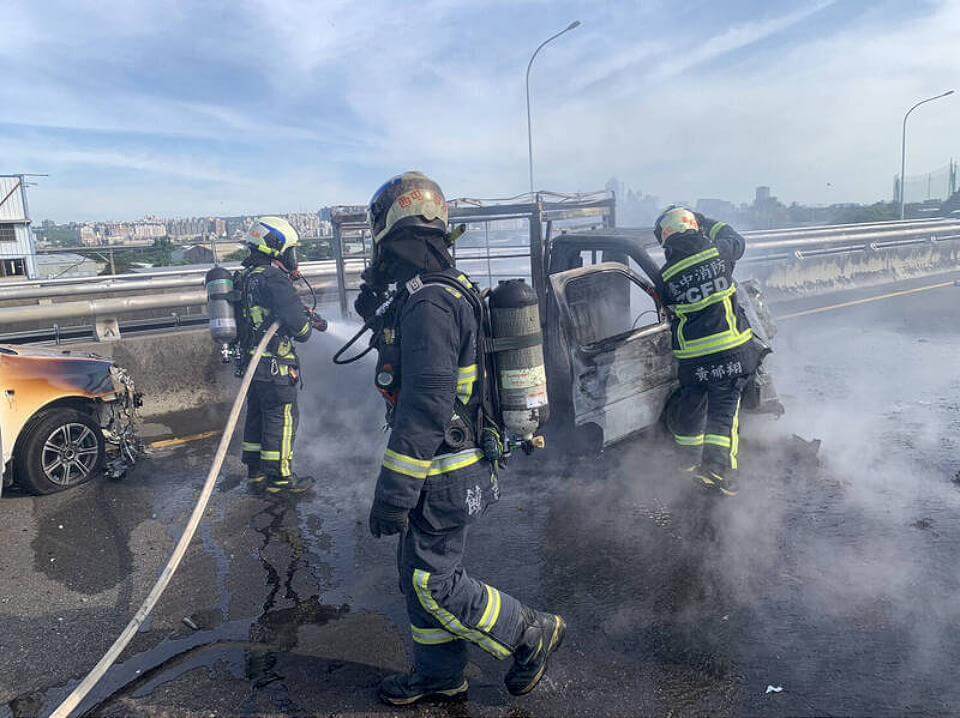 警方初步了解,事發當時拋錨的小客車駕駛開啟閃黃燈警示,並打電話報案請求協助,不料後方由黃姓男子駕駛的小貨車,突然衝撞車尾失控,波及另一輛在旁經過的轎車。隨後小貨車起火燃燒,由於火勢來的又猛又急,黃男在逃生過程中,臉部、背部、手部2度15%燒燙傷,而副駕駛座上的乘客則只有門牙斷裂,警消到場後將他們送醫急救。