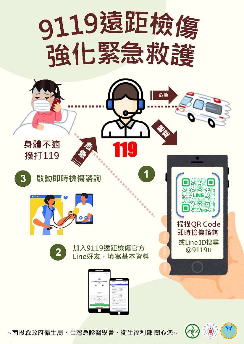 至於Line 9119遠距檢傷強化緊急救護系統,則是由衛生福利部與內政部消防署、急診醫學會共同設立,此群組的功能主要是可以讓民眾在身體不適時,在叫救護車之前,可以用 line 的方式讓系統判斷,或者連線專人醫師於線上用視訊的方式,協助民眾判斷病情嚴重度及做即時的檢傷諮詢,協助民眾更了解傷病況,以利後續送醫之判斷,歡迎民眾加入官方Line好友,Line ID 搜尋 @9119tt。