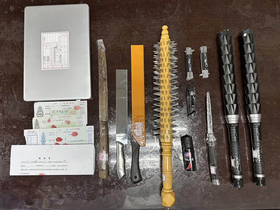 警方查扣刀械、棍棒等證物。畫面讀者提供