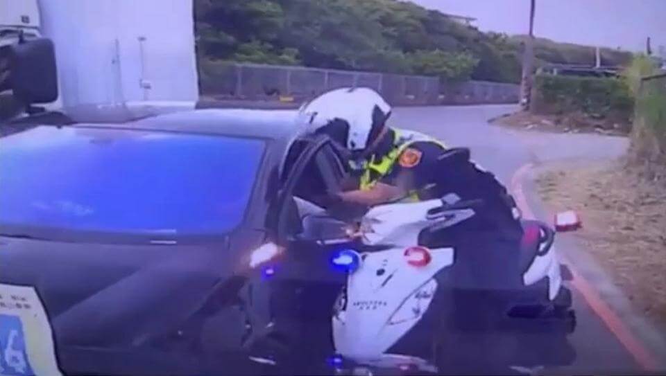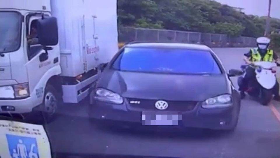 警方表示,員警在國道2號橋下,發現1輛深色轎車形跡可疑,因此上前攔檢盤查,原本車上女駕駛相當配合,隨後她謊報身分遭識破,就立即開車逃逸,員警也騎車尾隨在後,女駕駛在狹小道路逃逸過程中,原本要超越1輛小貨車,卻因對向有來車被迫停下,並擦撞小貨車動彈不得。
