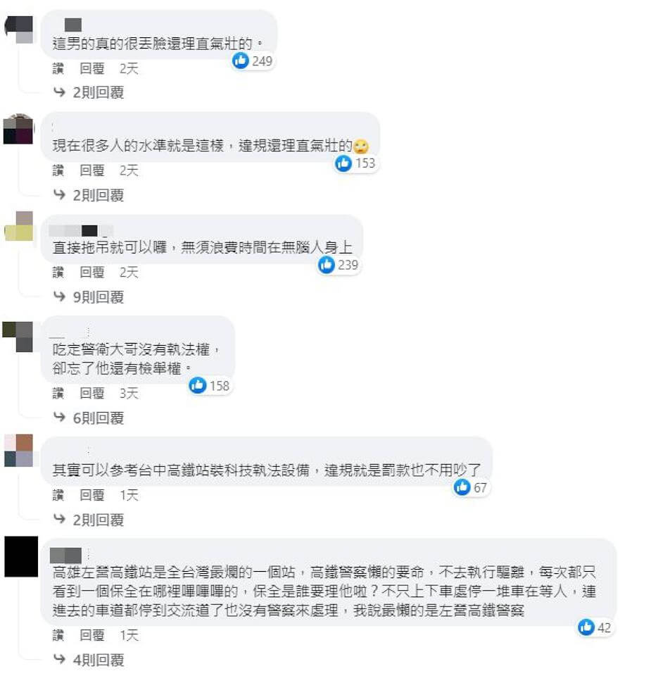 高鐵左營站27日11時許發生男子違規停車,經保全人員吹哨制止,但他卻依然故我未加理會,隨後還與保全人員發生口角,有目擊者看不下去拍影片PO網,果然留言一面倒,指謫男子違規還理直氣壯,更為保全人員委屈加油打氣。警方對此認定男子所駕駛的白色休旅車明確違法,依規定開立罰單舉發。