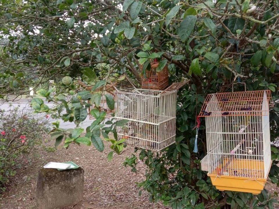 翁姓男子將鳥籠掛設在桂花樹下,吸引野生鳥類接近。翻攝新北市政府