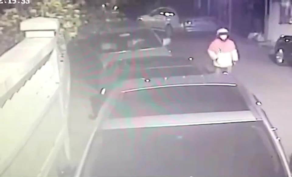 槍手穿著外送員外套變裝後,前往犯案地點。畫面讀者提供