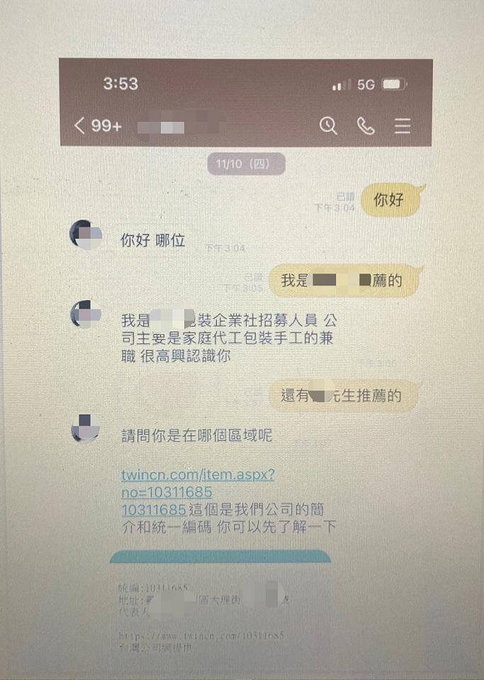 詐騙集團以家庭代工、兼職等名義騙取帳戶資料。畫面讀者提供