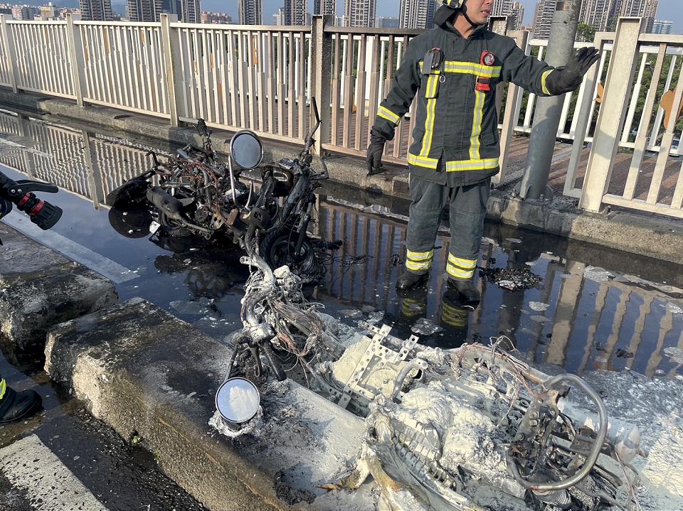 消防人員撲滅火勢後,3部機車僅剩下骨架。讀者提供