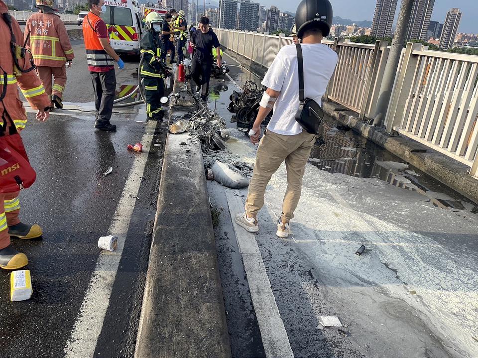 警方初步調查,當時先有3輛機車在橋上發生事故,有見義勇為的騎士,在事故後方幫忙指揮示警,不料有1輛機車疑似未注意前方路況,直接衝撞上去造成二次車禍,隨後就起火燃燒。