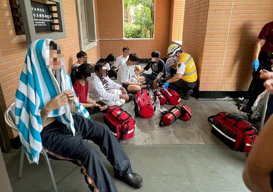 實驗室中9名學生分別受到燒燙傷及吸入性嗆傷,救護人員進行緊急處置。畫面讀者提供