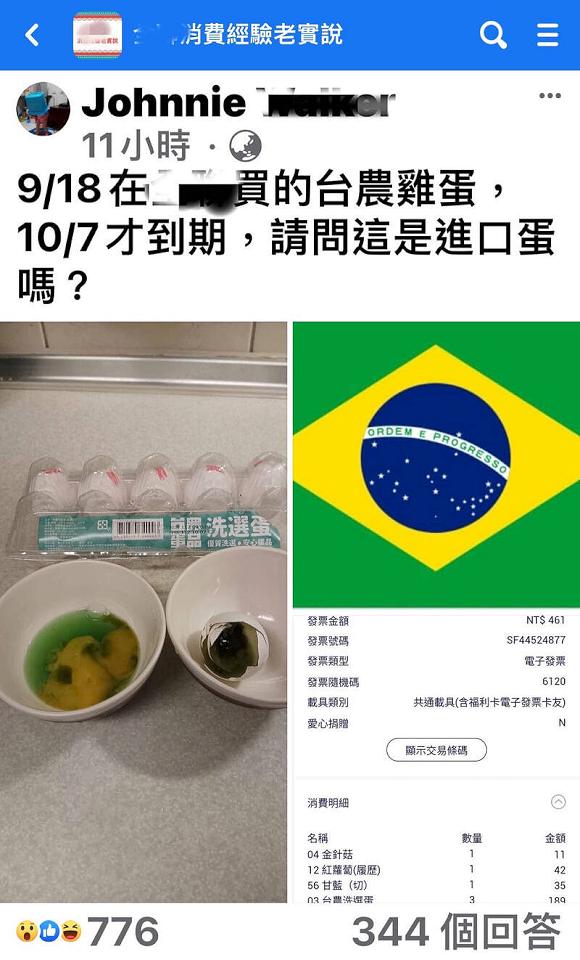 農業部指出,聲稱進口蛋為綠色雞蛋的訊息,近期大量在網路傳播,有人聲稱自己9月18日在全聯購買雞蛋,並在訊息中貼上巴西國旗與電子發票,提問這顆臭蛋是否為進口蛋並接受訪問,再加上部分媒體與政論節目未經查證並渲染,引起社會大眾恐慌,因此向台北市中正二警分局報案,希望透過檢警調查澄清事實真相。
