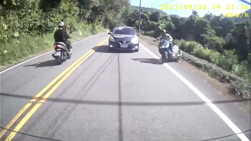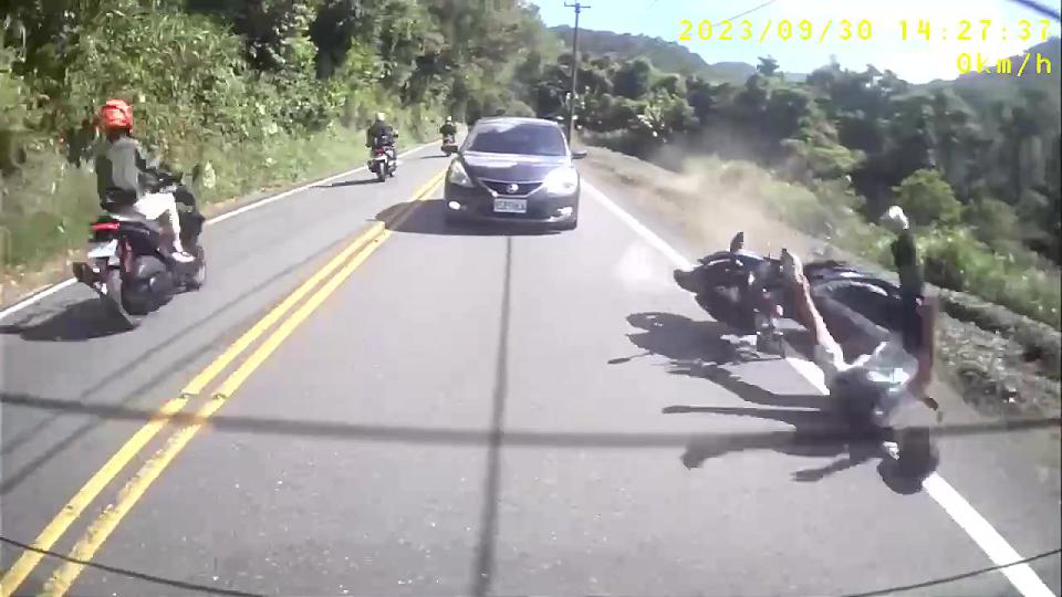 根據行車紀錄器畫面,當時王姓機車騎士(23歲)騎車跟在轎車後方,行經事發地點時,騎士從右側超車後,後輪滑出路面造成機車失控,王姓騎士直接拋飛後,在路上翻滾好幾圈後,摔落一旁的茶園內。