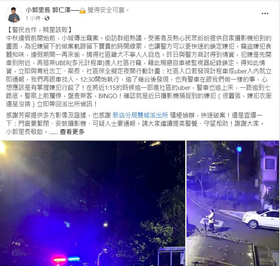警方表示,台北小城住戶在中秋節前夕9月26日2時許,發生第1起住宅遭竊案件,當警方還在追緝竊賊時,中秋節連假又發生2起竊案,經過與里長郭仁澤調閱監視器研判,竊賊應該是搭乘多元計程車進入社區後,潛入住家搜刮財物,因此鎖定所有進入社區的計程車。