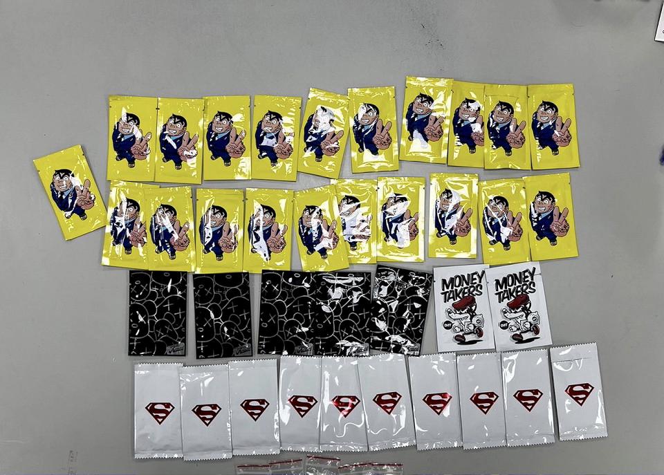員警搜查藍色包包果然發現,裡面裝有大批「兩津勘吉」、卡通圖樣的毒咖啡包,這下人贓俱獲百口莫辯,經清點有搖頭丸、愷他命毒咖啡包共43包。(記者余珩維/台北報導)