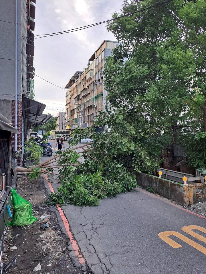 另外龍安派出所也接獲民眾報案,龍安街152巷口私人地上一顆高約3公尺半的樹木,因不堪強風吹襲傾倒在路上阻礙往來交通,員警獲報立即前往現場,封鎖路段進行交通疏導,同時與居民輪流使用鋸子,將樹木鋸成數段搬離路道,半小時內將障礙排除使交通恢復順暢。(記者黃子瑋/桃園報導)