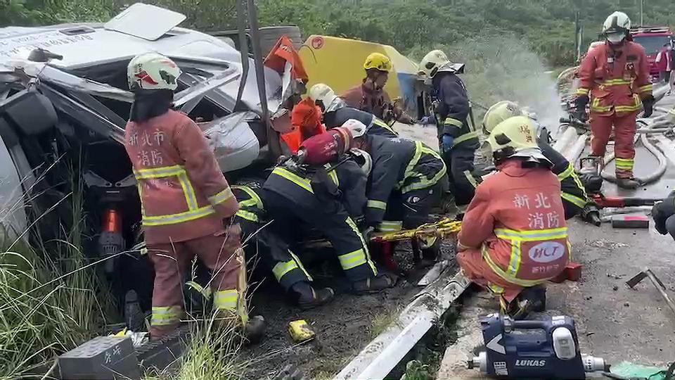 警消獲報後趕往現場,用工具將變形車體破壞,經過1小時的搶救,才將駕駛救出送醫,不過人已經沒有呼吸心跳,相關車禍發生原因,警方還要調查釐清。(記者余珩維/新北報導)