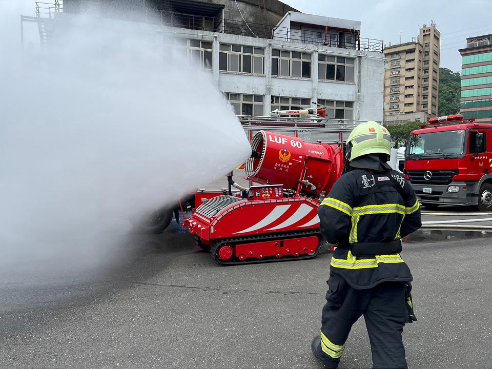 台北市消防局表示,消防人員透過遠端操控,由「LUF60 消防機器人」深入危險場域,代替消防人員進行風險較高近距離救援,可以減少可能發生噴濺、爆炸或極端火勢危害的情況,隨著消防救災智慧科技發展之日新月異,各項救災裝備器材持續進化更新。