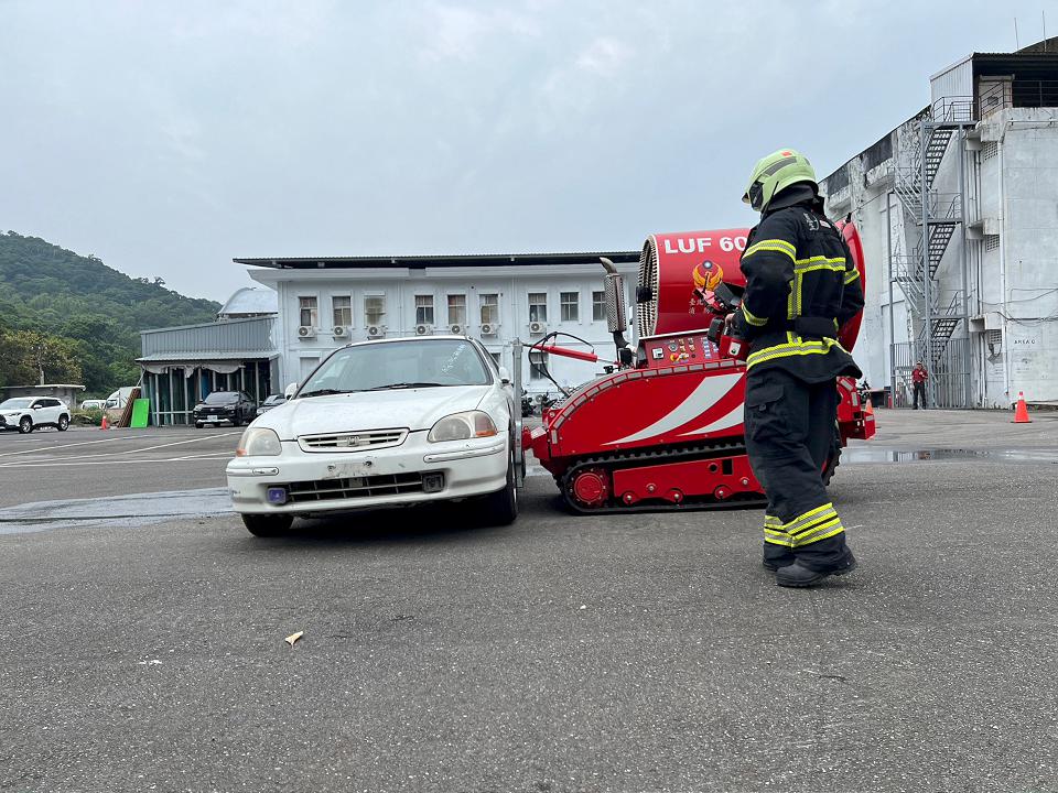 「LUF60 消防機器人」驅動輪採用履帶式傳動系統,可克服複雜地形障礙,這次展示項目模擬汽車起火情境,消防機器人運用射水砲塔,以水柱、水霧、泡沫射水執行救災任務, 射水射程可達80公尺,另外還可以移除障礙物、以及架設排煙風管展現強大的排煙能力。