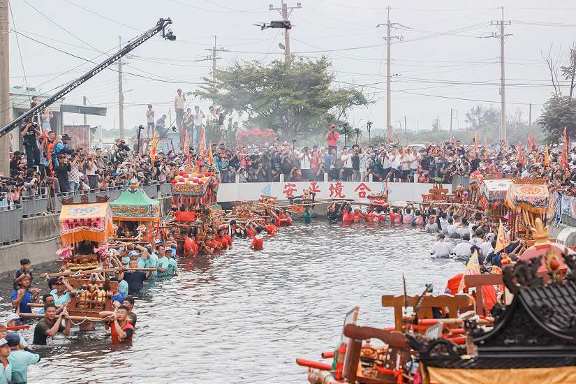 嘉義縣布袋鎮新塭嘉應廟昨日舉辦年度宗教盛事「衝水路、迎客王」,來自全國的信眾和友宮神轎一早就聚集在王船碼頭,隨著衝水路儀式正式開始,眾人扶轎下水,場面嗨翻天,嘉義縣長翁章梁、立法委員蔡易餘及布袋鎮長蔡瑋傑等人出席,手持清香祈求台灣風調雨順,百姓平安。