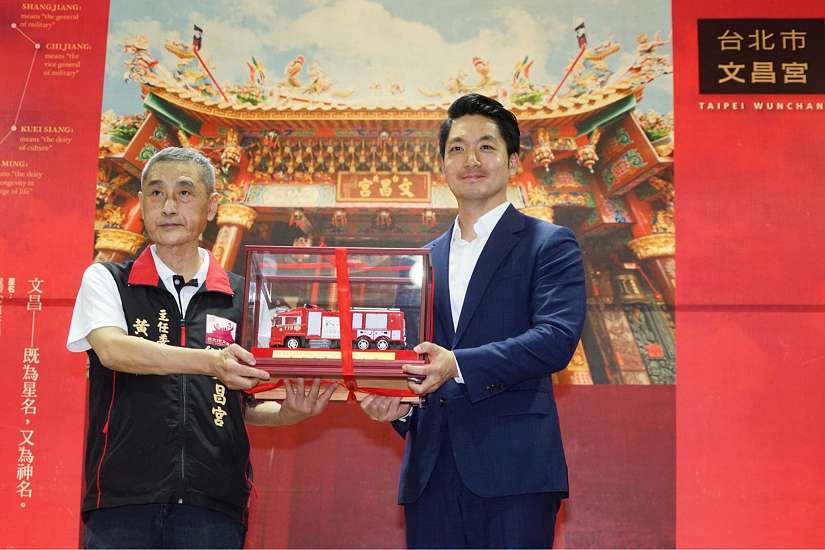 為充實臺北市救災能量,香火鼎盛的臺北市文昌宮,昨(6)日捐贈一輛近700萬元的大型水廂消防車,由臺北市長蔣萬安代表接受。蔣萬安盛讚文昌宮是臺北市政府最重要的夥伴,相信這輛水箱消防車加入後,未來在救災上一定可以發揮最大的效益。