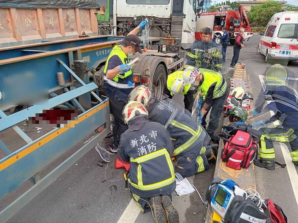 新北市台64線台北港匝道口,6日10時許發生嚴重車禍,1輛砂石車疑似煞車失靈,直接衝撞前方7部大小車輛,其中1輛大型重機後座女乘客,受困車下已經失去生命跡象,警消將人救出後緊急送醫,由於車禍現場佔據匝道全線車道,警方封閉路段引導提前改道。