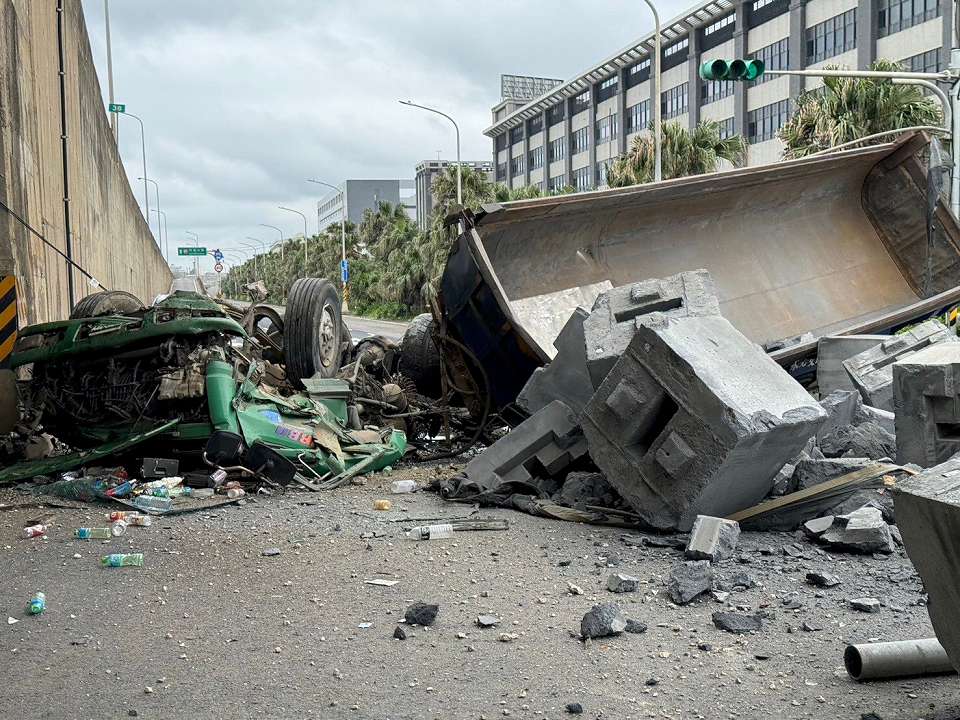 台61線桃科高架路段,6日10時許發生砂石車墜落意外,駕駛當場彈飛出車外,躺在車道上沒了呼吸心跳,而砂石車頭整個被壓扁成鐵餅,警消將人緊急送醫救治,但相關車禍發生原因,警方還要調查釐清。
