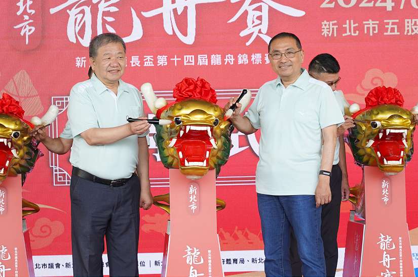 「新北市議長盃第14屆龍舟錦標賽」將在6月9日、10日登場,昨(15)日在微風運河舉行祭江點睛儀式,新北市長侯友宜與議長蔣根煌一同為龍舟點睛祈福,祈求賽事平安順利,也邀請全民共襄盛舉,欣賞國際級水上盛事。