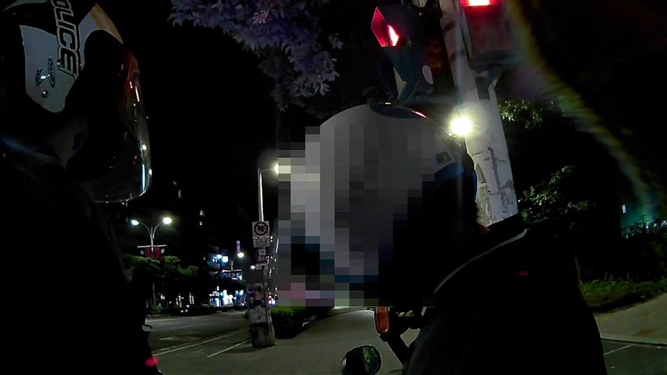 騎士因安全帽未扣帶遭警攔查。讀者提供