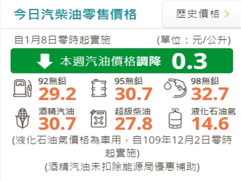 台灣中油公司自明(8日)凌晨零時起汽、柴油價格調降0.3元及0.1元,這是今年連續油價調降,參考零售價格分別為92無鉛汽油每公升29.2元、95無鉛汽油每公升30.7元、98無鉛汽油每公升32.7元、超級柴油每公升27.8元。