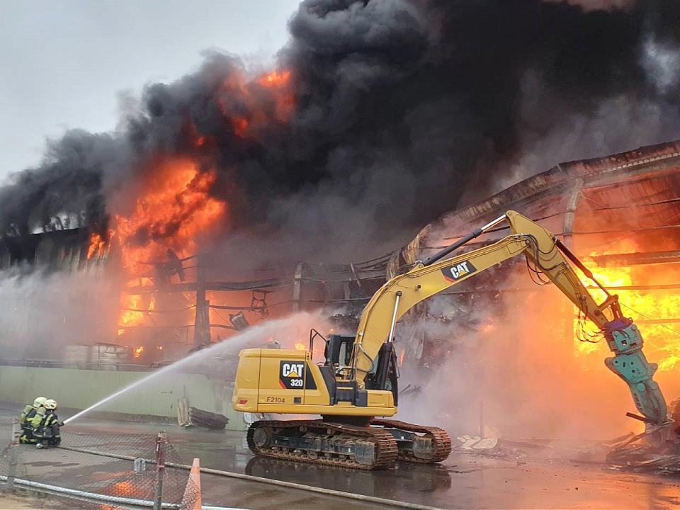 桃園市新屋區長祥路800多號的環保回收工廠,3日15時許發生火警,由於工廠級倉庫有不少易燃物品,因此火勢相當猛烈,已經將廠房吞噬,黑色濃煙不斷飄向天際,目前因場內有石化工業設備,警消已經全力搶救中。