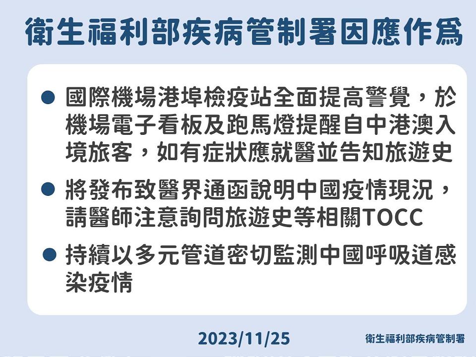 目前國內呼吸道感染疫情並未像中國一樣大幅攀升,且類流感疫情自9月中旬以來,已連續7週呈下降趨勢,但兩岸民眾往來頻繁,因應中國呼吸道疾病疫情上升趨勢,已加強監測相關疾病的流行病原。另外機場港埠檢疫站全面提高警覺,衛福部加強持續密切監控國內外相關疫情流行狀況,視疫情發展調整防疫措施,並強化衛教宣導,提升往返中港澳旅客的防疫知能,同時加強整備防疫醫療相關物資與量能。(記者黃子瑋/台北報導)